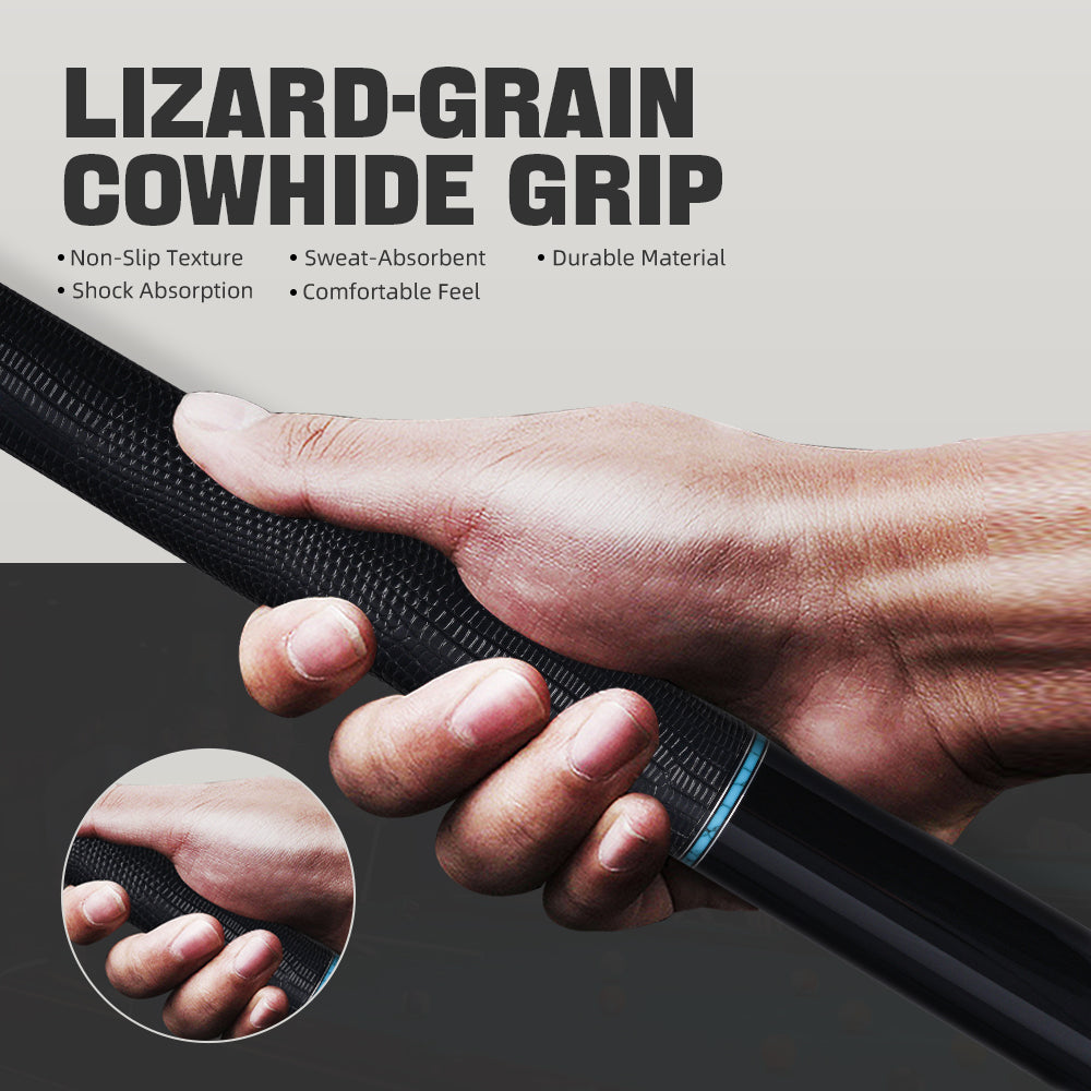 The butt is crafted from rare ebony, one of the world’s most valuable woods. Its slow-growing nature produces a unique black pattern with a glossy patina that feels luxurious in the hand while remaining highly durable. The grip is made from soft, breathable cowhide with a lizard texture that ensures excellent anti-slip performance and comfort during long sessions.