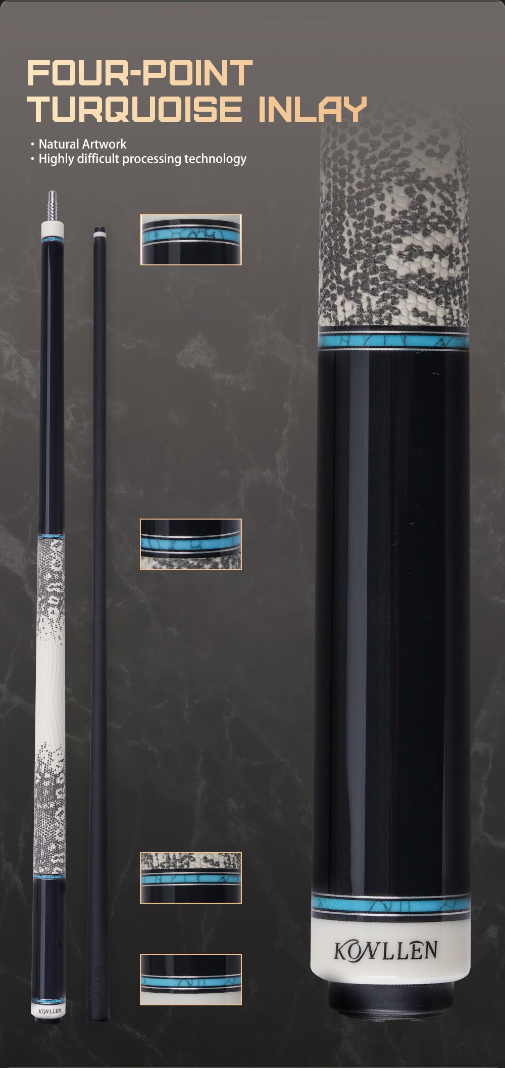 The cue features four handcrafted turquoise inlay rings, a stone cherished for over 5,000 years. In Eastern and Western cultures alike, turquoise symbolizes victory and success. Known as the “stone of success” in countries such as the United States, it adds not only elegance but also a sense of tradition and prestige to every shot.